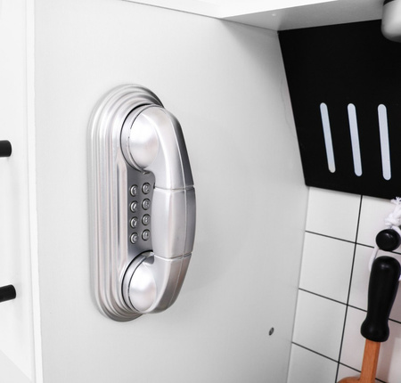 | - podświetlany okap, - migające światełka na dystrybutorze wody, - podświetlane, migające płyty grzewcze, - odgłosy gotowania i smażenia, - odgłosy „nalewania wody” z dystrybutora, - otwierana lodówka, - otwierana kuchenka, - otwierana pralka, - otwierana mikrofalówka, - kran z ruchomymi kurkami, - ruchome pokrętła w kuchence. | |
