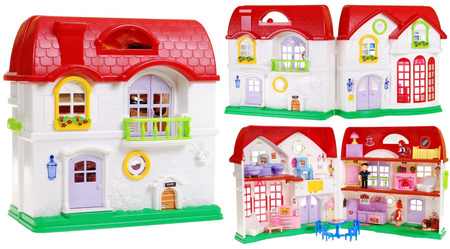 | - rozkładany, piętrowy domek - willa, - 4 figurki mieszkańców – Mama, Tata, Dziecko i Piesek, - 23-częściowy komplet mebli do salonu, jadalni, łazienki, kuchni i innych pokoi składający się z: - wanny, - szafki z umywalką, - toalety, - ławy, - kominka, - sofy, - fotela, - pianina, - stołu z krzesłami, - łóżka, - komody, - szafy na ubrania, - szafki pod telewizor, - lodówki - lampki nocnej, - lampy stojącej, - toaletki, - zestawu kuchennego | |