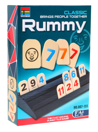 | | Rodzinna, logiczna gra Rummy to propozycja dla dzieci od trzeciego roku życia. Celem gry jest wyłożenie na stół wszystkich swoich kostek ze stojaka do gry. Gracze tworzą różne kombinacje kostek i dopasowują je do układu na stole. Gra daje mnóstwo radości i wyzwala kreatywność. Zasady gry Mieszamy kostki i układamy je numerem w dół na stole. Każdy gracz losuje jedną kostkę. Osoba z najwyższym wylosowanym numerem na kostce rozpoczyna grę, a gra przebiega zgodnie ze wskazówkami zegara. Następnie odkładamy wszystkie kostki z powrotem na stół i układamy je w blokach po siedem kostek a ostatni będzie miał 8 kostek. Bloki są przydzielane do graczy, 2 bloki na gracza razem 14 kostek. Kostki pozostałe po przydziale stanowią pule. Gracz ustawia kostki na tabliczce w taki sposób by inni zawodnicy nie widzieli ich. Jeżeli wśród otrzymanych kostek gracz otrzyma trzy kostki o takim samym numerze lub kolorze (np. dwie czerwone trójki, dwie niebieskie szóstki, dwie czarne dwunastki), ma prawo poprosić o ponowne rozdanie kostek wszystkim graczom. Gra polega na wykładaniu na stół utworzonych przez gracza serii lub grup kostek. Seria składa się z co najmniej trzech kostek o kolejnych numerach w jednym kolorze. Grupa natomiast to trzy lub cztery kostki z tym samym numerem w różnych kolorach. W zestawie są dwie uśmiechnięte buźki które zastępują każdą kostkę brakującą do utworzenia grupy lub serii i mają taką samą wartość jak kostka którą zastępują. Gracz może wyłożyć na stół swoje kostki gdy zgromadził jeden lub kilka układów o łącznej wartości co najmniej 30 punktów. Jeżeli gracz nie ma układów pozwalających na wyłożenie kostek na stół, bierze z puli jedną dodatkową kostkę. W następnej kolejce po otwarciu gry, gracz może dokładać swoje kostki do układów leżących na stole, musi jednak wyłożyć w każdym ruchu co najmniej jedną kostkę ze swojej tabliczki. Jeżeli nie może tego zrobić losuje kolejną kostkę z puli. Obowiązuje limit czasu dwie minuty na każdy ruch. Jeżeli gracz nie zdąży w tym czasie, musi wziąć z puli dodatkową kostkę. Gra kończy się gdy jeden z graczy wyłoży na stół wszystkie kostki ze swojej tabliczki. Następnie gracze zliczają punkty. Przegrany sumuje numery jakie pozostały mu na tabliczkach i zapisuje je ze znakiem minus. Zwycięzca zapisuje sumę punktów pozostałych graczy ze znakiem plus. Jeżeli gracz w chwili zakończenia ma na swoim stojaku znaczek z uśmiechniętą buźką dostaje dodatkowe minus sto punktów na swoje konto. |