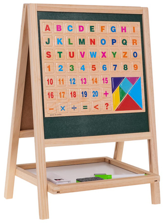 Drewniana dwustronna tablica z akcesoriami dla dzieci powyżej 3-go roku życia. Tablica z jednej strony jest biała i służy do malowania pisakiem dołączonym do zestawu, z drugiej strony zaś jest kredowa, do malowania kredą dołączoną do zestawu. Zarówno po stronie białej jak i kredowej możemy przyczepiać magnesy. Do zestawu dołączono magnesy z literkami, cyframi, działaniami matematycznymi i figurami przestrzennymi. Zestaw wyposażono w praktyczną półeczkę na dole, mieszczącą wszystkie akcesoria. Funkcje zestawu: - odpowiedni dla dzieci powyżej 3-go roku życia, - wykonany z drewna, - dwustronna tablica, kredowa i do malowania pisakiem, - tablica z dwóch stron jest magnetyczna, - praktyczna półeczka na akcesoria, - w zestawie znajduje się kreda, gąbka, pisak, magnesy. |