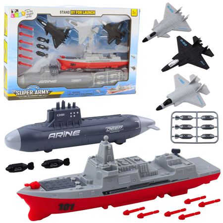 - Zestaw militarny z lotniskowcem, łodzią podwodną oraz trzema samolotami myśliwskimi to wspaniała propozycja dla dzieci, które uwielbiają dynamiczną zabawę w wojsko, strategię i akcję.